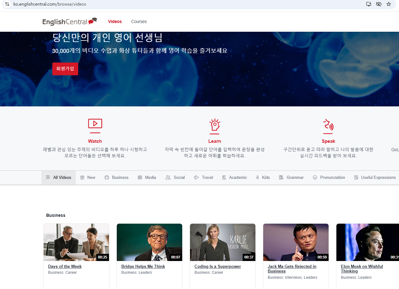 EnglishCentral은 수천 개의 영어 비디오 콘텐츠를 학습 자료로 제공합니다.