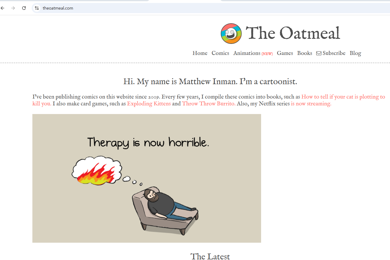The Oatmeal은 2009년 Matthew Inman에 의해 만들어진 웹사이트로, 그의 유머러스한 웹툰과 독창적인 글을 중심으로 운영됩니다. 사이트에는 일상, 인간관계, 동물(특히 고양이와 개), 그리고 인터넷 문화 등을 다룬 웹툰이 많으며, 그의 독특한 그림체와 솔직한 스토리텔링이 특징입니다. 특히 고양이에 관한 웹툰과 책들은 고양이 집사들에게 폭발적인 인기를 얻었고, 그의 작품은 수많은 언어로 번역되어 전 세계에서 사랑받고 있습니다.