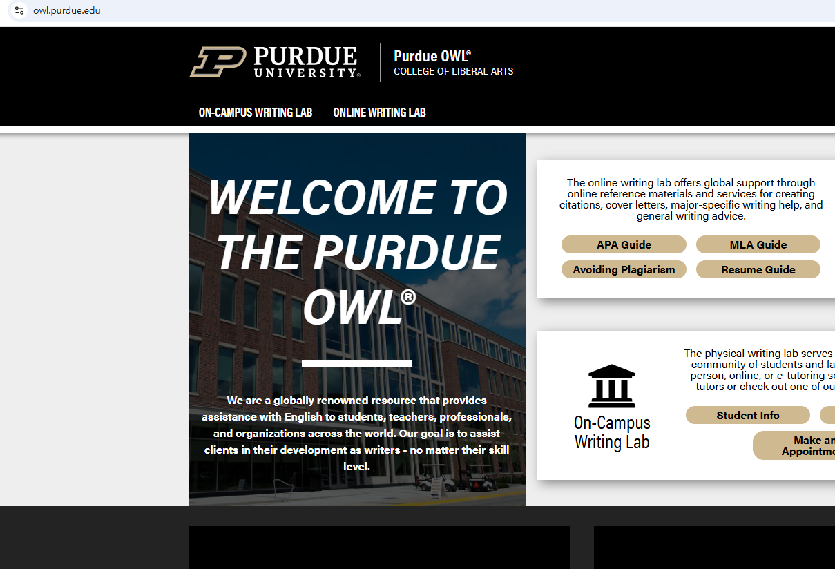Purdue OWL은 미국 퍼듀대학교(Purdue University)에서 운영하는 온라인 글쓰기 지원 사이트입니다.